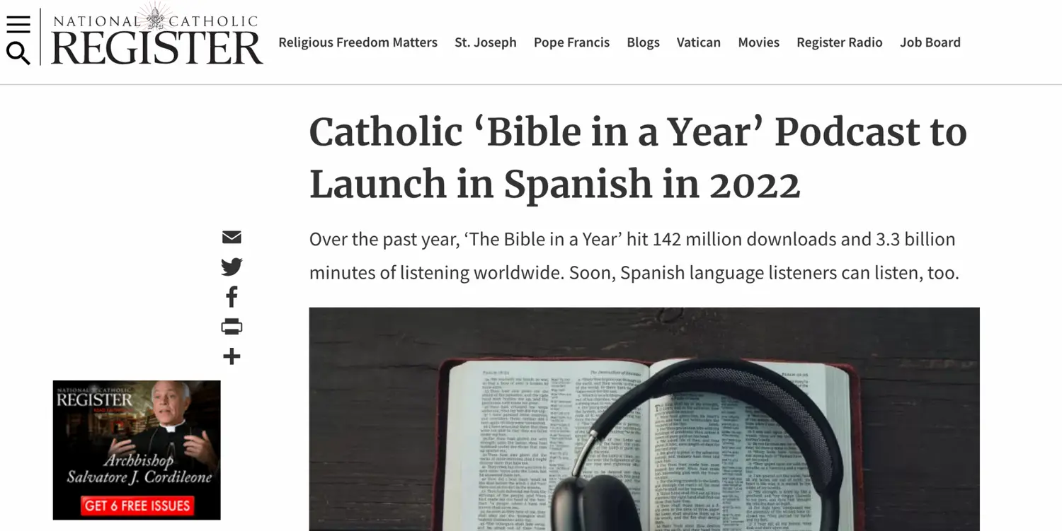 With more certainty than a year ago (screenshot), I can say that "La Biblia en un Año con Fr. Sergio Serrano y el P. Dempsey" has been a hit: It has been on the charts in 61 countries since it launched! 📈 1/12 pic.twitter.com/m640JvyZNm